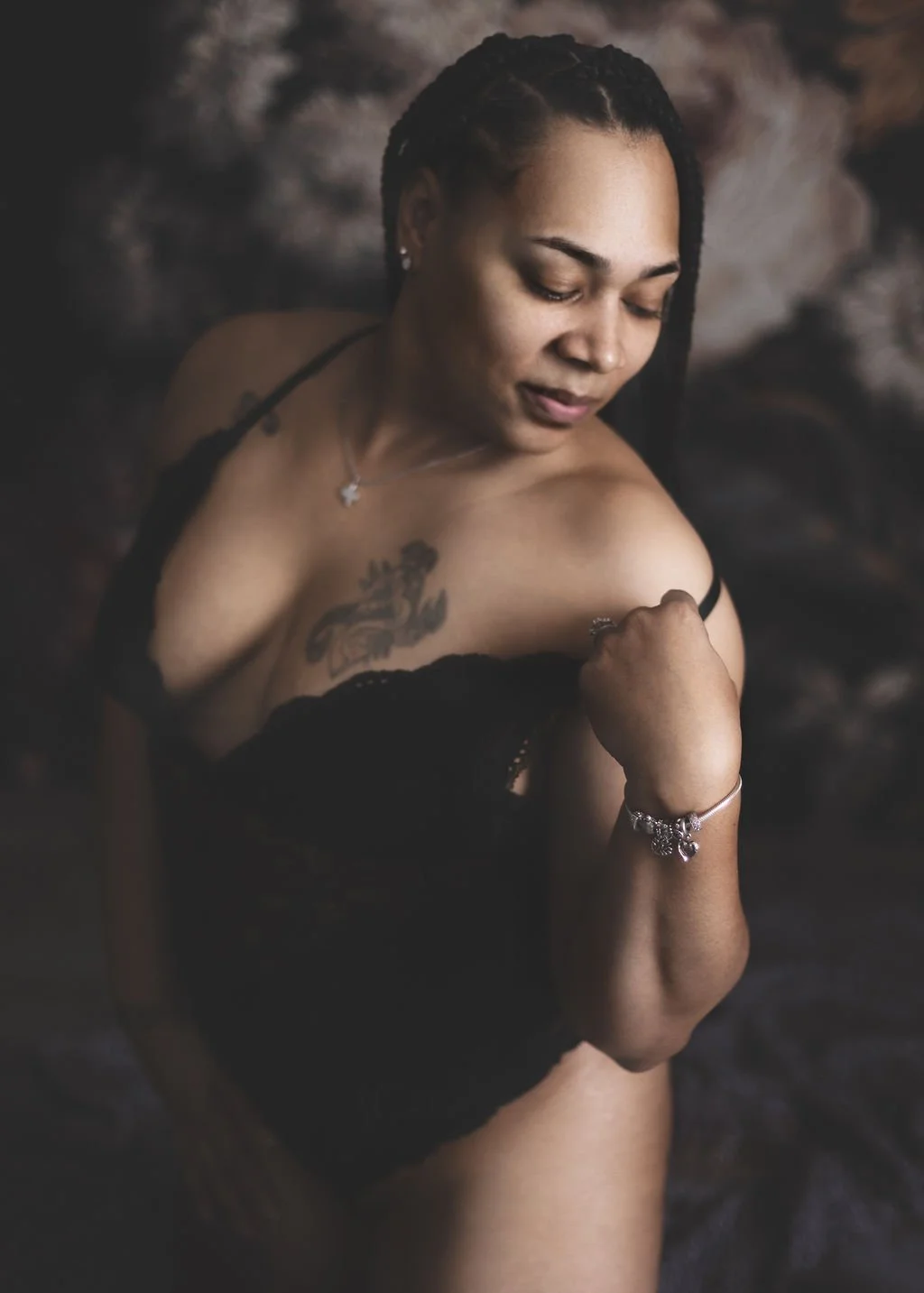 1-3 outfit changes can be accomodated during your session. You may bring your own wardrobe options or choose from our exlusive gowns and fabrics. Many clients choose to pose in their personal lingerie, an off-the-shoulder sweater, a men’s tuxedo shirt, draped fabric,etc. The options are endless and they are all yours!